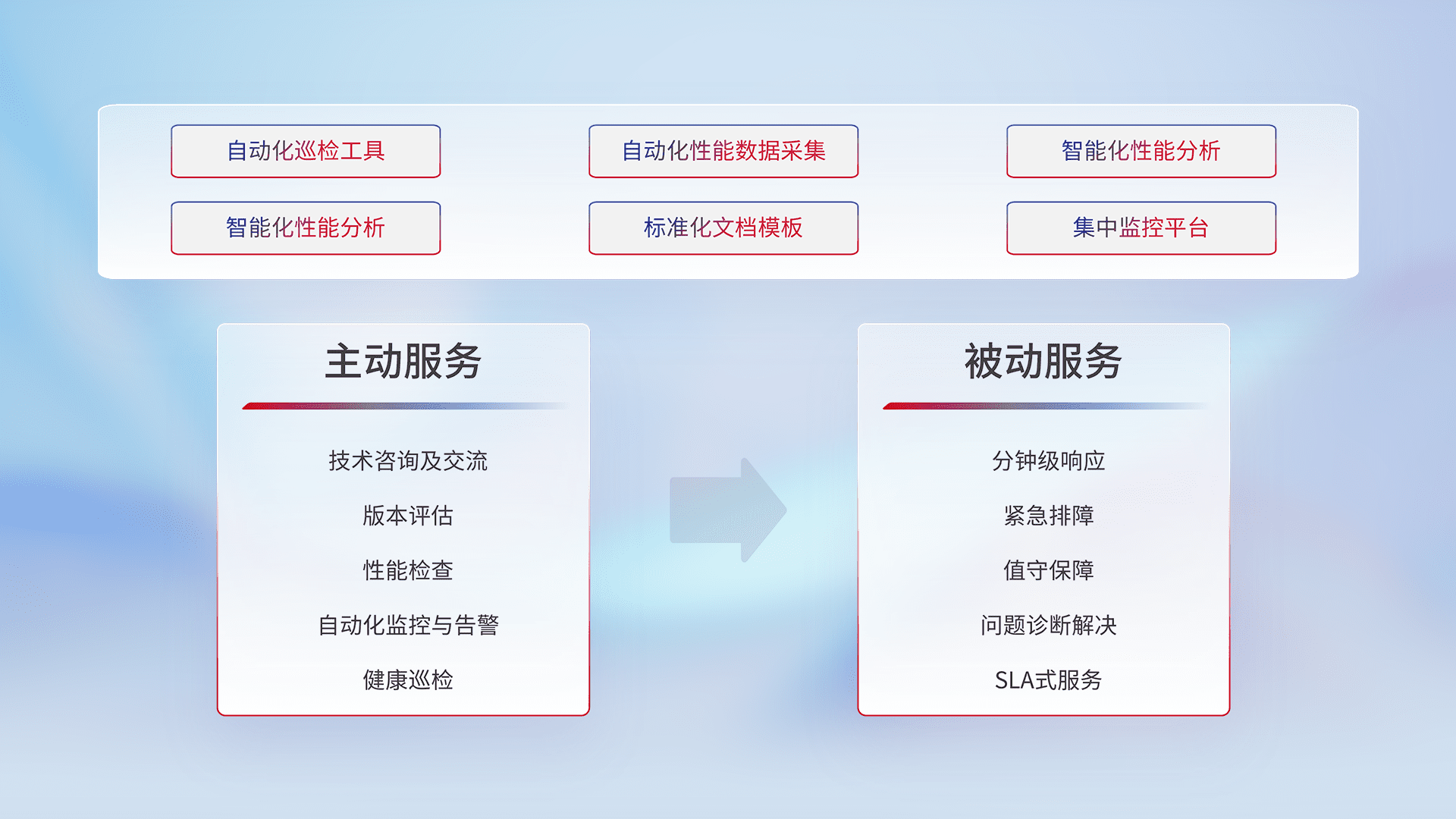 智能化工具和标准化文档,,保障服务质量,,提供主动服务(包含技术咨询、、、、版本评估、、性能检查、、自动化监控与告警、、、、健康巡检)和被动服务包含(分钟级响应、、、紧急排障、、、值守保障、、、、问题诊断解决、、SLA服务)。。