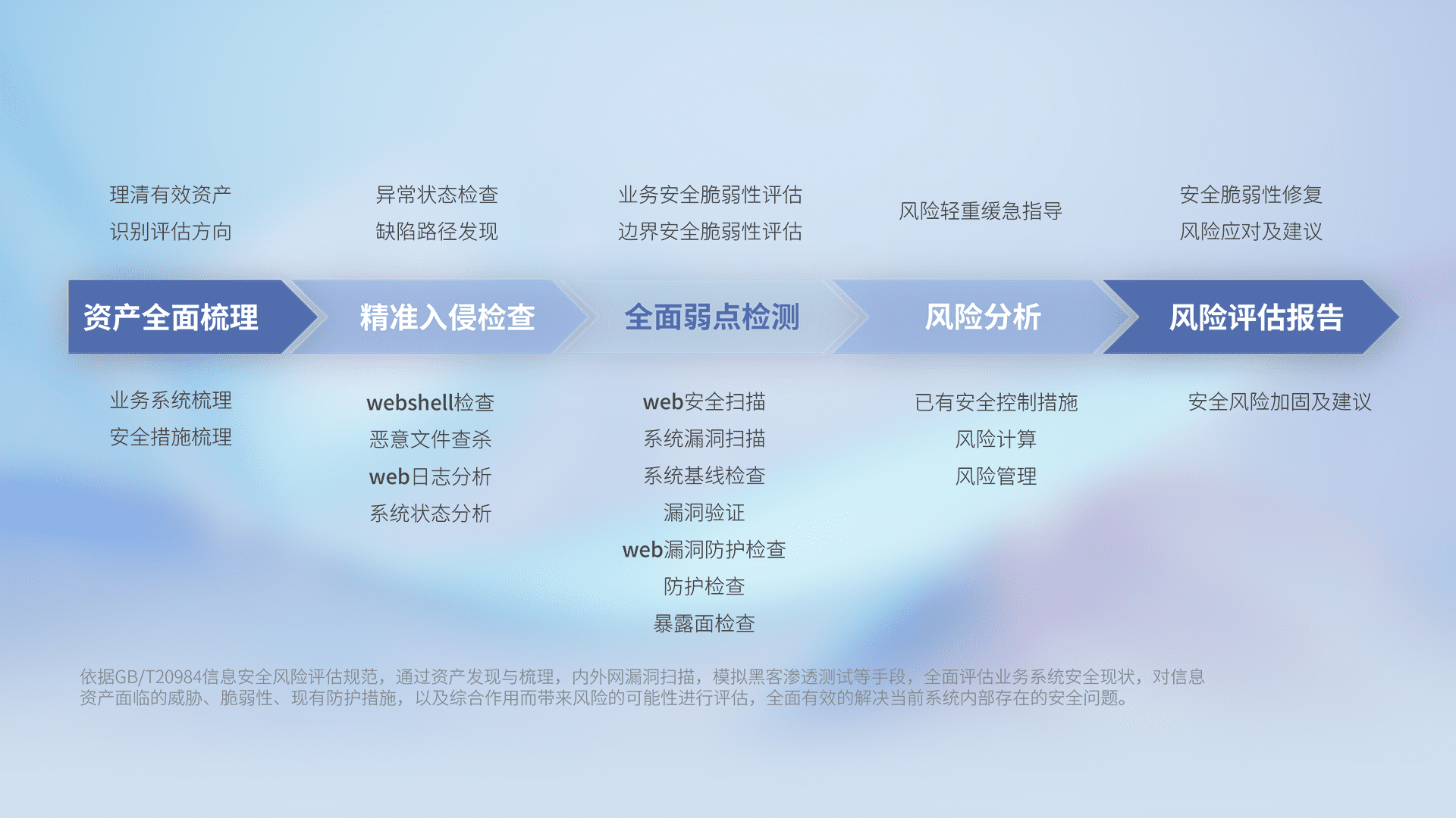 针对客户行业特性,,,以专业的安全服务+多厂商联合解决方案提供专属的一站式安全管理服务,,,帮助客户全面感知网络空间威胁,,,基于识别、、、检测、、、、分析、、、防护、、、、监测、、、、响应的服务理论模型,,,,从方案咨询、、、集成交付、、、、评估验证、、、、优化加固、、、、运维运营,,,,致力于为客户提供完整的闭环管理式安全服务。。。以实战经验为客户打造高抵御风险的安全体系,,,帮助客户发现威胁、、对抗威胁、、、处置威胁,,不断积累安全对抗能力,,,,持续保障数字化安全。。。
